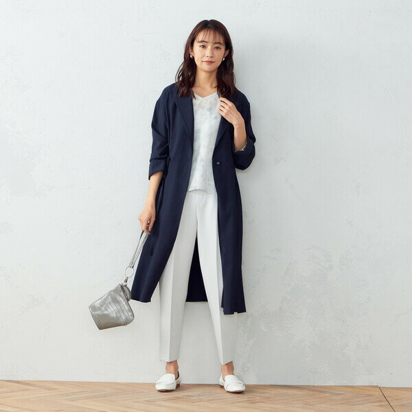 すっきりとしたノーカラーなので、ON・OFFの着こなしに幅広く対応。