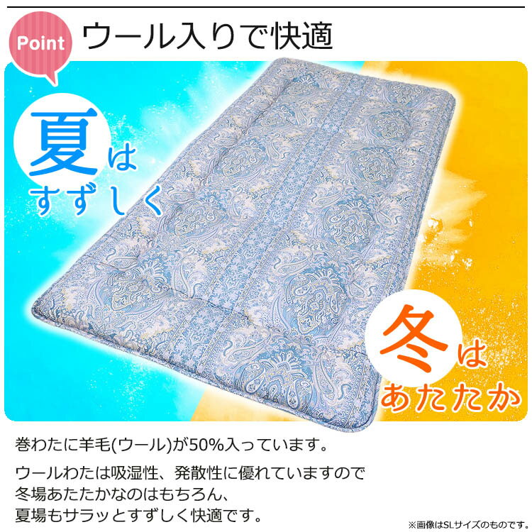ウールわたは吸湿性、発散性に優れていますので 冬場あたたかなのはもちろん、夏場もサラッとすずしく快適です。