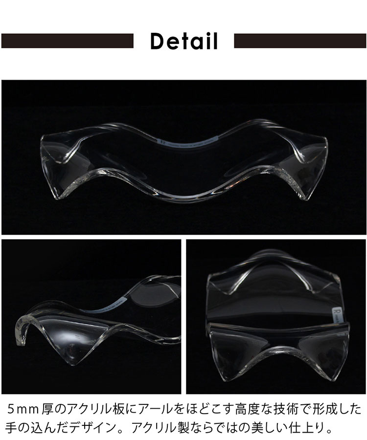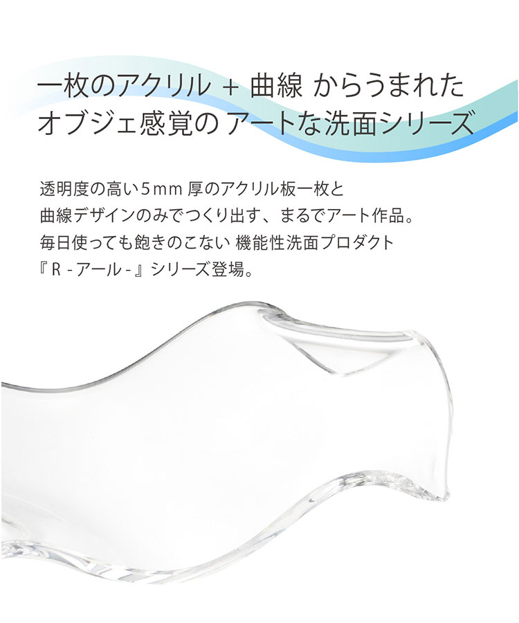商品名 R (アール)ソープディッシュ メルト スペック 幅約9.0×奥行き約17.5×高さ約3.0cm 素材 メタクリル樹脂 生産国 中国製 特徴 透明度の高いアクリル板1枚で、つなぎ目を作らず作ったアートな洗面シリーズ【Rアール】ひとつ洗面コーナーに置くだけでおしゃれな雰囲気に。